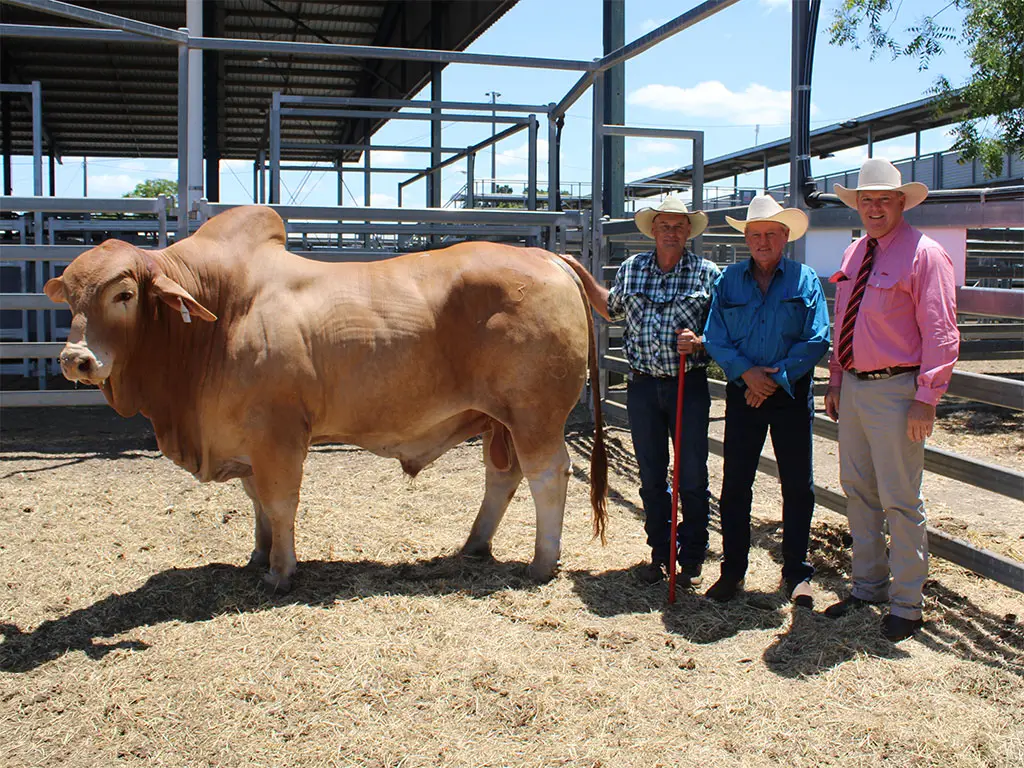 The top priced bull, Minlacowie Arizona 44 (PP) Pictured with the Vendor Jason Spann, buyer Bill Neill-Ballantine and agent Mark Scholes. Photo courtesy of Queensland Country Life.